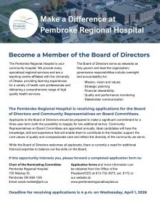 Overnight Snow Clearing to Close Downtown Pembroke StreetsHeritage Village to host Annual Meeting at Civic CentreLane Reductions Planned for Angus Campbell Drive During Gas Valve RepairsWhitewater Region, Pembroke firefighters team up for winter rescue trainingDrug toxicity deaths drop in latest report from Renfrew County Health UnitThe Pembroke 48Retired Barry's Bay Nurse Wins Catch the Ace Weekly PrizePetawawa celebrates expansion of NeuroUnique World ServicesBail violation investigation leads to drug chargeHappy Family Day from MBC!OPP charge Pembroke man with assaulting officer, uttering threatsPembroke woman charged after alleged impaired driving, restaurant fraudSpring intake begins for Summer Company and Starter Company Plus Business ProgramsThe Pembroke 48Pembroke Mitsubishi Presents "Kings Korner" Dax KenneyWhat's Good in Pembroke? "Children at Play" Pembroke Symphony Orchestra show hits Festival Hall February 21stPembroke Kiwanis Music and Dance Festival returns Feb. 23Upper Ottawa Valley OPP officer named Member of the Year for 2025Ace Indoor Golf Presents Volunteer Appreciation Day: Rick PilonAce Indoor Golf Presents Volunteer Appreciation Day: Melanie Freeman