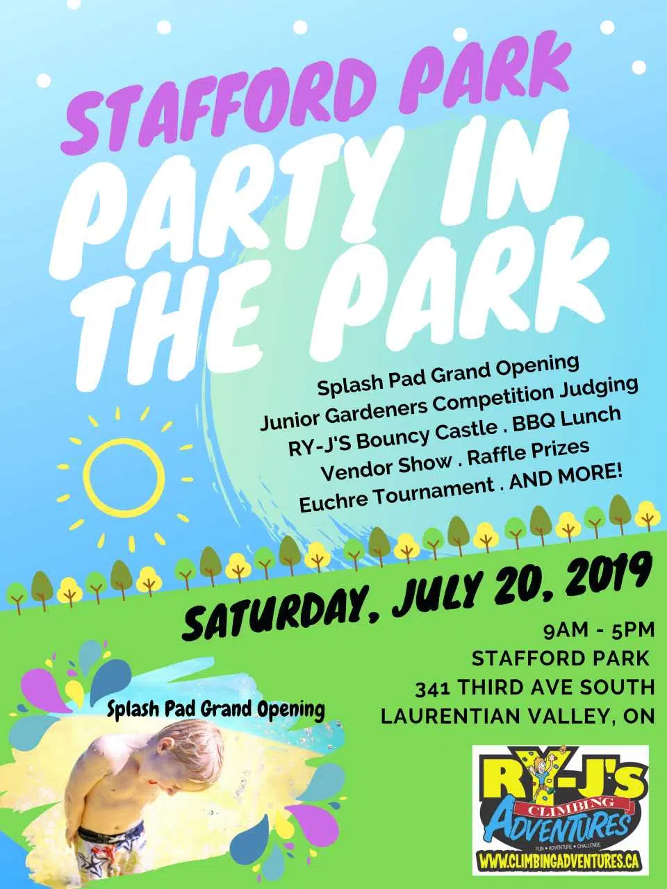 The grand opening of the new splash pad in Laurentian Valley takes place this weekend. On Saturday, come out to Stafford Park on Third Avenue to cool off at the new 2,200 square foot splash pad. Party in the Park takes place between 9:00am and 5:00pm with something for everyone including a vendor show, bouncy castle, BBQ lunch, euchre tournament and fire department meet and greet. The ceremonial grand opening of the splash pad takes place at 10:00 am. Proceeds from the BBQ will be invested back into the park. Judging of the 3rd annual Junior Gardeners Competition will also showcase what local youth have been growing for the past month. The family friendly splash pad includes accessible play areas for all ages that are spaced out in a manner to allow easier supervision.