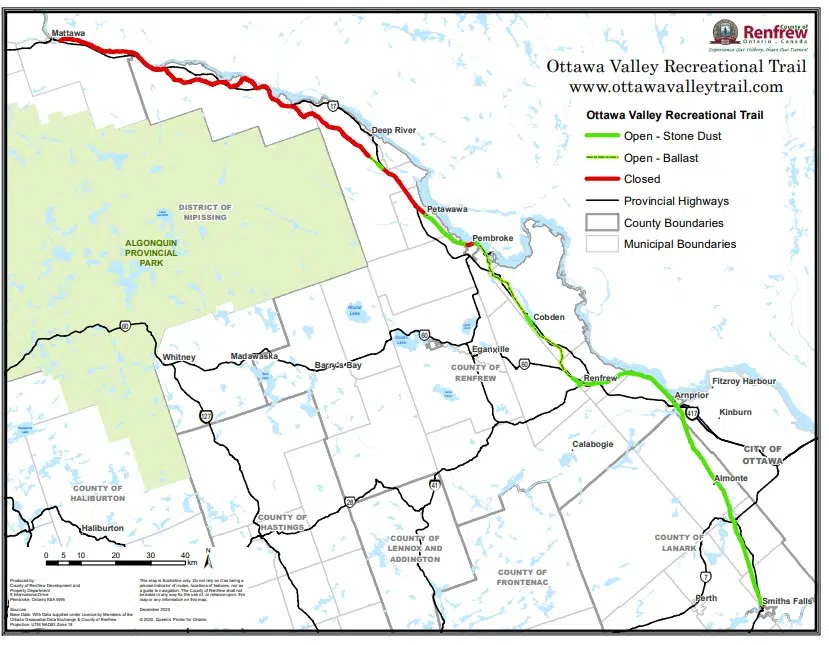 The almost 300 kilometer stretch of trail between Smiths Falls and Mattawa is owned by the County of Renfrew, Lanark County and Township of Papineau-Cameron.