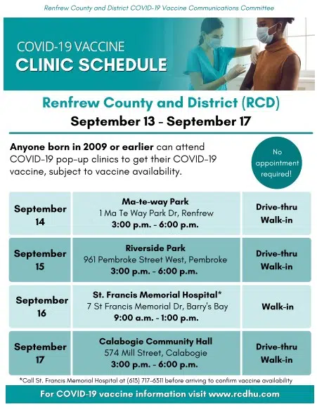 The Renfrew County and District Health Unit (RCDHU) has released the COVID-19 vaccine pop-up schedule for the week (September 13th to 17th).