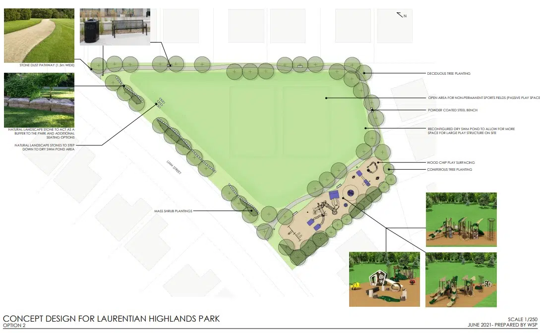 Work on the new park in the Laurentian Highlands subdivision is expected to begin sometime in 2022. The final design for the park will incorporate features from both concepts presented to council.