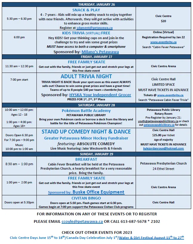 On Sunday, January 29th, there’s a Cabin Fever Breakfast at the Petawawa Presbyterian Church from 8:30am to 1:00pm (for a very reasonable cost), free skating at the Civic Centre Arena from 1:00pm to 2:00pm and Civitan Bingo in the Civic Centre Hall with doors opening at 5:30pm.