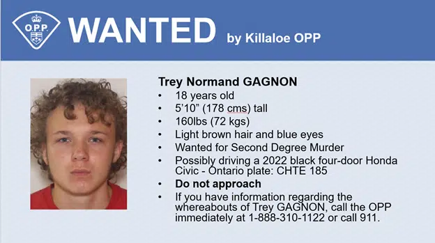 Police are seeking a warrant for the arrest of 18-year-old Trey Gagnon of Laurentian Valley Township, for Second-Degree Murder.