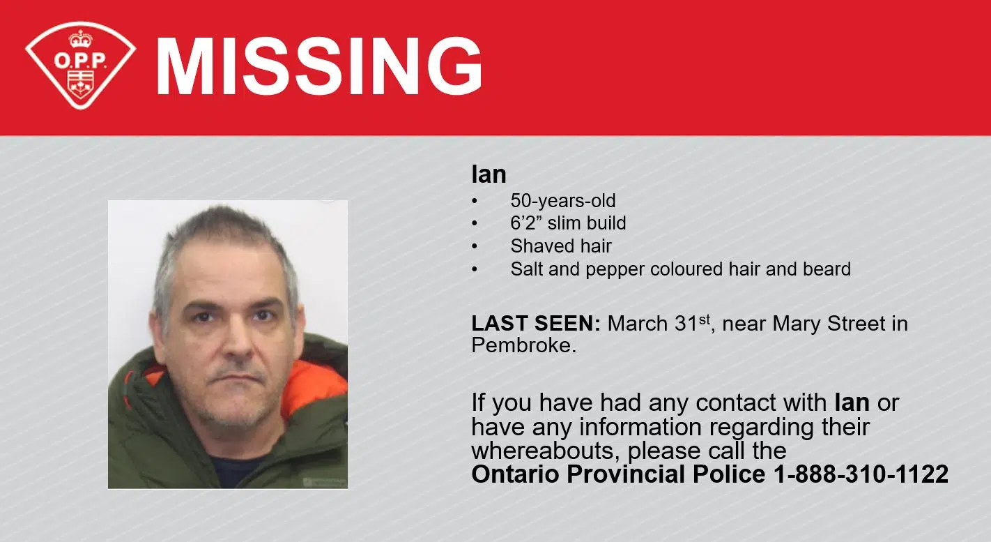 Upper Ottawa Valley OPP is asking for help in locating a missing man. 50-year-old Ian was last seen back on March 31st near Mary Street in Pembroke. Ian is described as a 6’2 man with a slim build. He has a shaved head with salt and pepper hair and a beard. Anyone with information about his location is asked to contact the police.