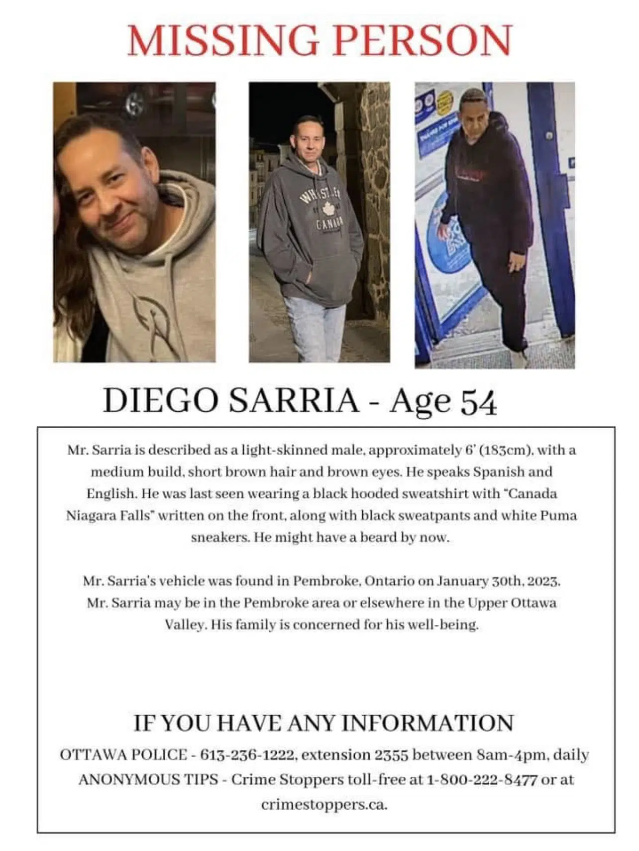 It has been six months since Diego Sarria, a 54-year-old man, mysteriously disappeared. He was last seen in the Kanata area on January 17th in the afternoon. Recent reports suggest that he might be in the Deep River area or elsewhere in the Upper Ottawa Valley.