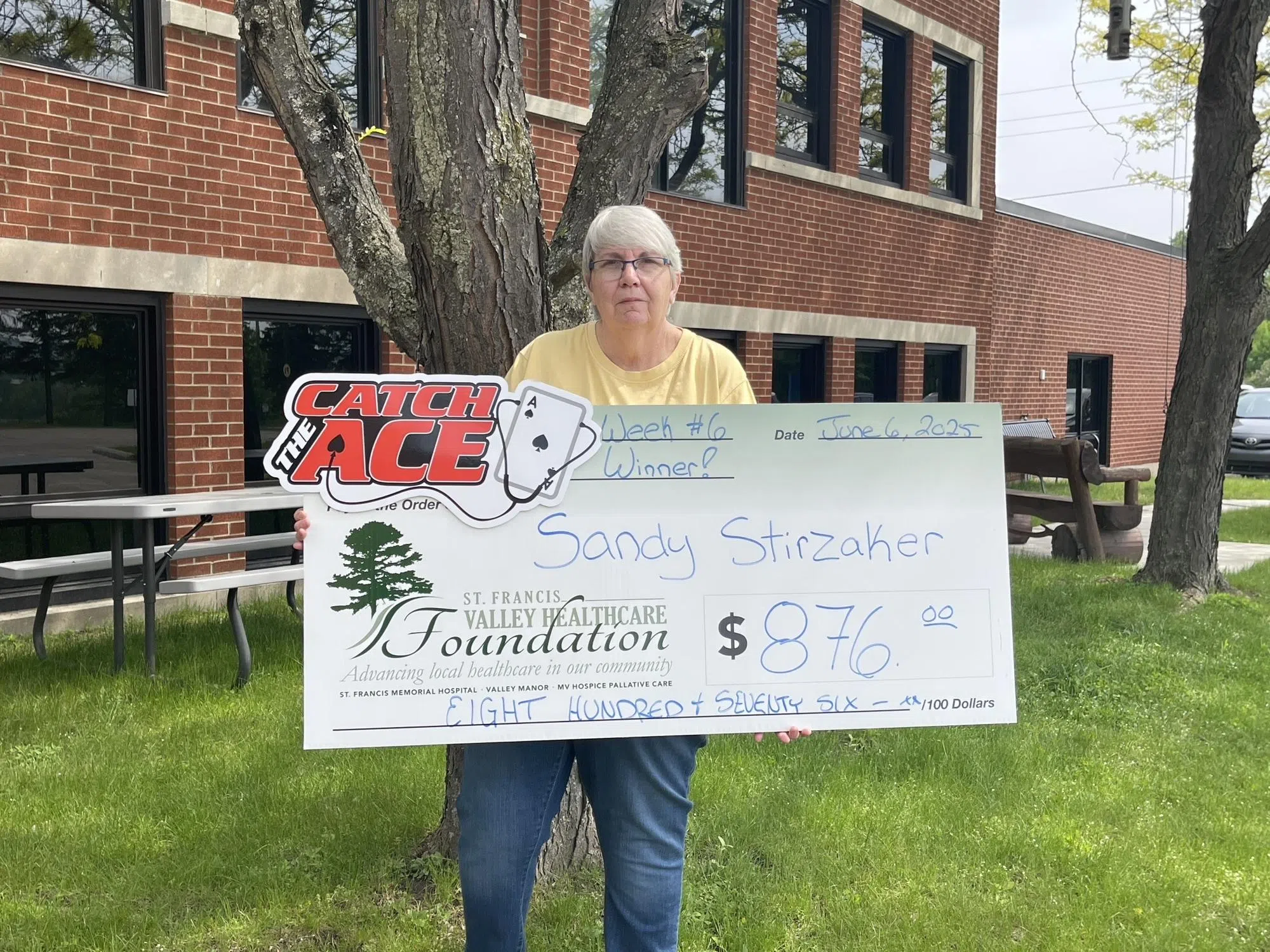 After drawing the Three of Diamonds, she claimed the weekly prize and decided to give back. In honour of the excellent care her husband received at St. Francis Memorial Hospital and Valley Manor, Sandy donated part of her winnings to the St. Francis Valley Healthcare Foundation. The rest will go toward a home improvement project.