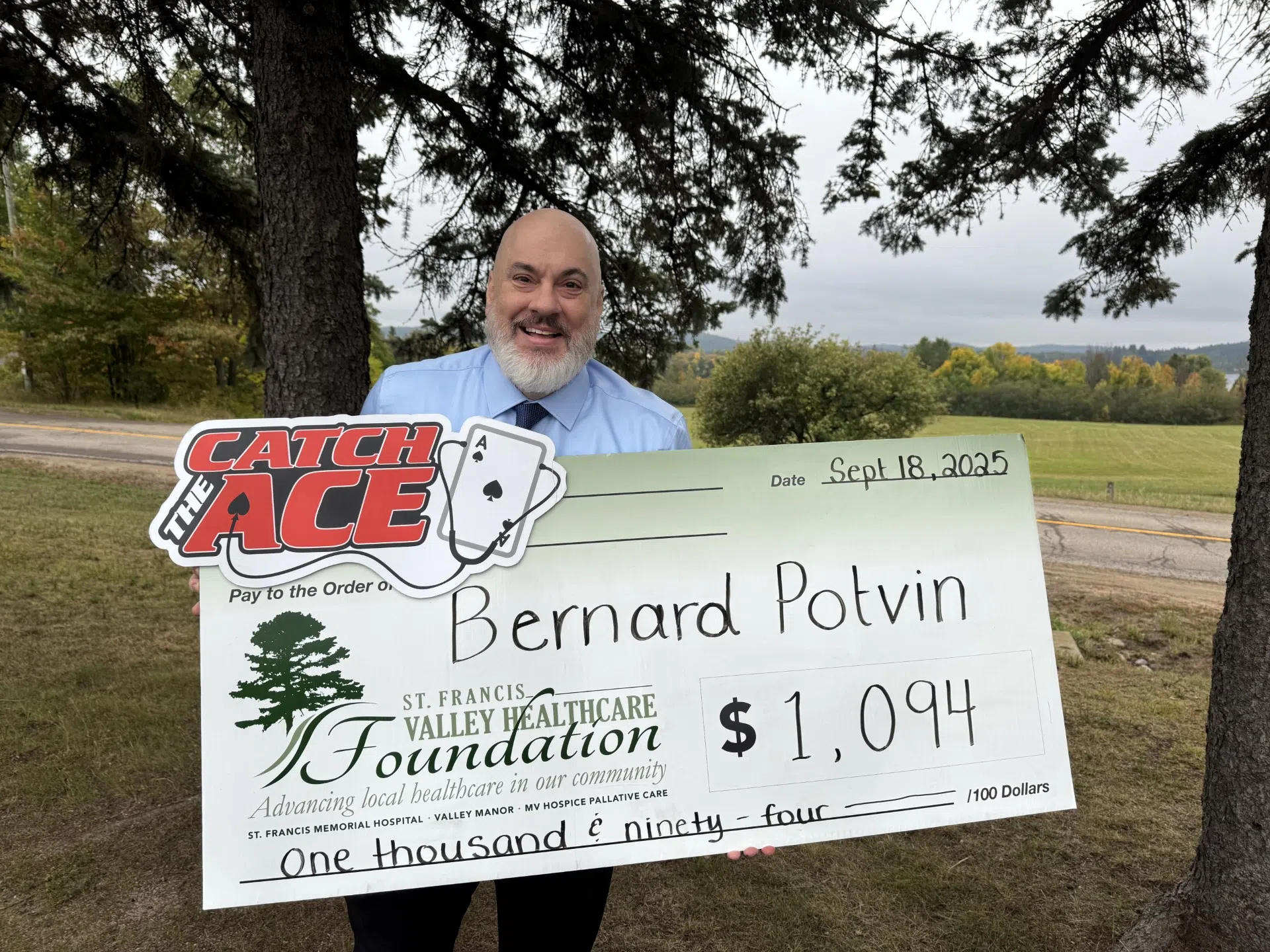 The St. Francis Valley Healthcare Foundation is thrilled to announce our first weekly winner of Round Nine of Catch the Ace! Bernard Potvin of Ottawa took home the prize after consistently playing since online tickets became available. He selected envelope 24, a number with multiple meanings for him. It is his mom’s birthday and connects to his work at the Beer Store, where he often sells “two-fours”. Envelope 24 revealed the eight of diamonds. Bernard plans on using his winnings toward a new set of vehicle tires. Next week’s estimated weekly prize is $1000, with the progressive jackpot currently at $4,141. Find the Ace of Spades and it is all yours!