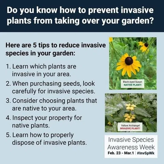 Find out which plants are invasive in your area; when buying seeds, check the labels- and choose only plants that are native to the area. Inspect your property for native plants and learn how to properly dispose invasive ones.