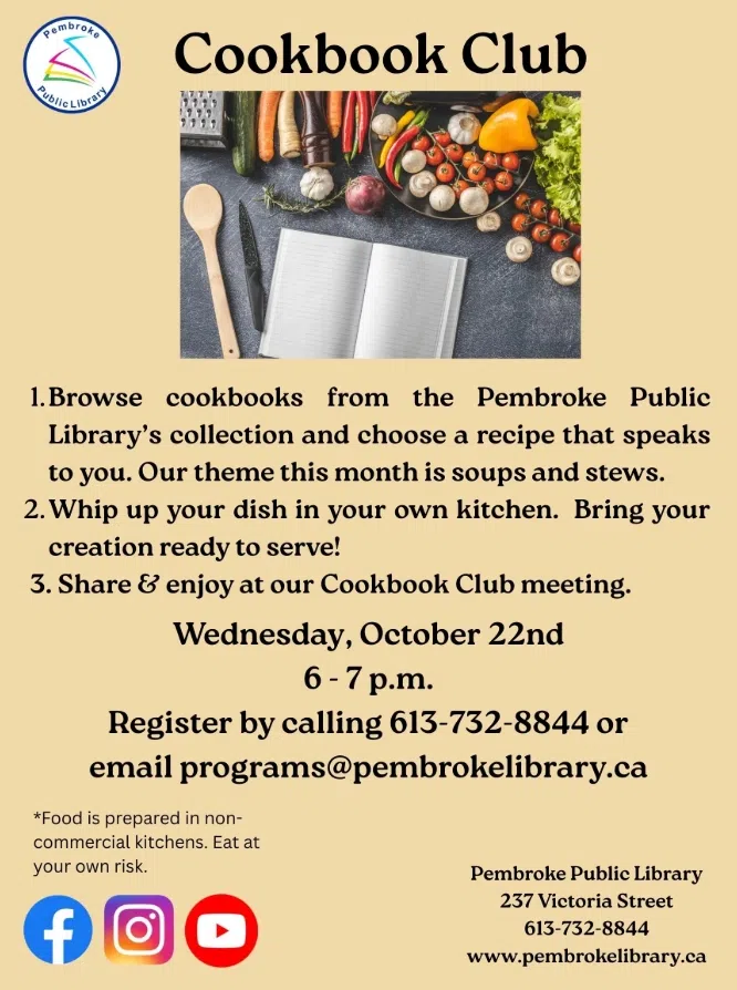 Browse cookbooks from the Pembroke Public Library’s collection and choose a recipe that speaks to you. Our theme this month is soups and stews.